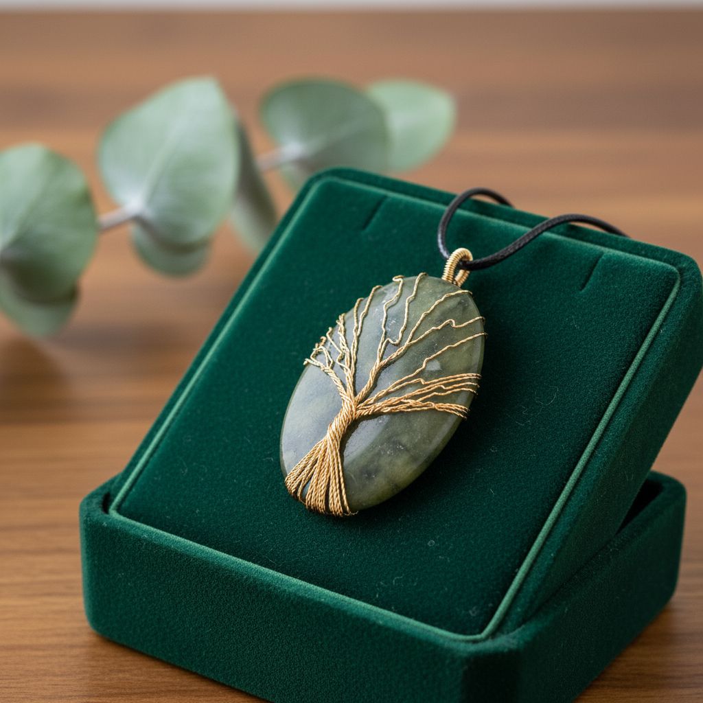 Ce pendentif en wire wrapping révèle un jaspe ancien, veiné comme une terre sacrée, sur lequel s’élève un délicat Arbre de Vie. Ses branches métalliques enlacent la pierre telle une force primordiale, porteuse d’enracinement, de sagesse et de renouveau. Un talisman poétique, union de la Terre et du Souffle.