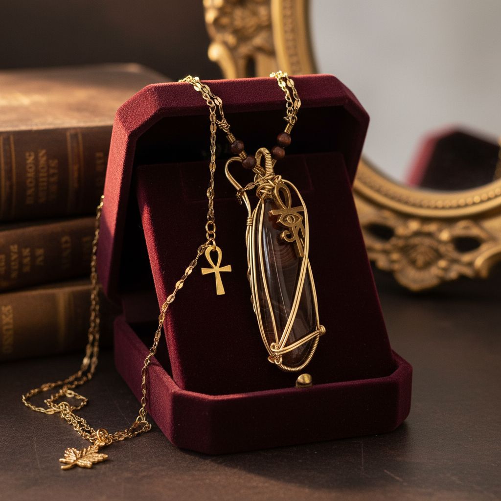 Tissé en wire wrapping, ce talisman met en lumière un sardonyx aux stries protectrices, pierre d’ancrage et de courage. Au centre de son éclat repose la croix d’Ankh, symbole de vie éternelle et de sagesse ancienne. Un bijou mystique, solaire, porteur de force et de renouveau.