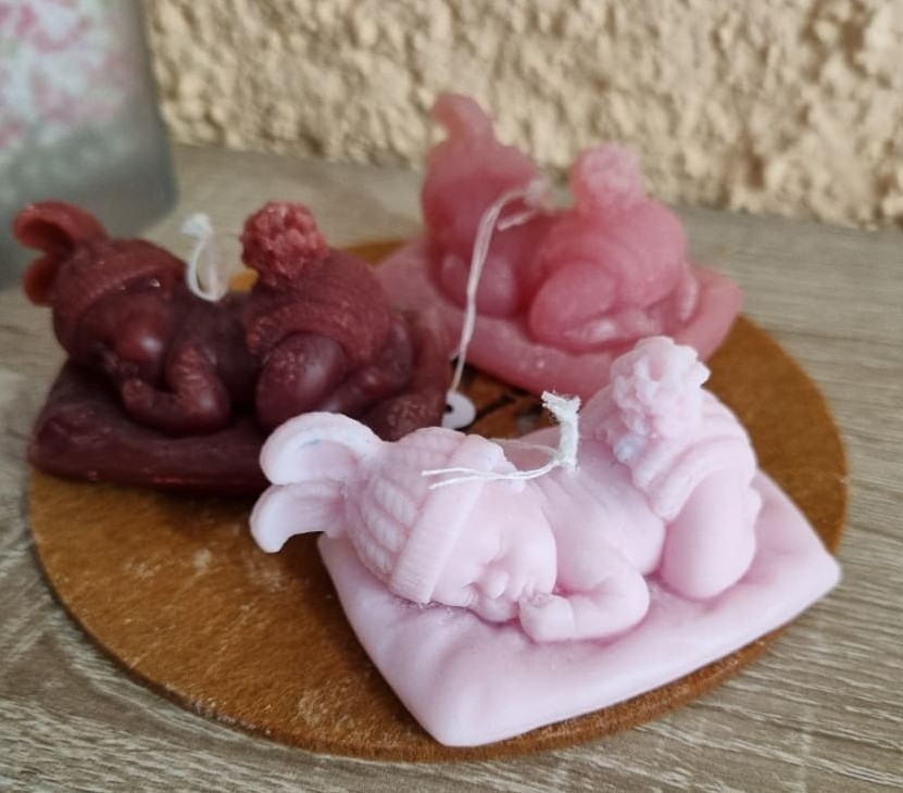 Bougie moulé bébé sur coussin en 100% végétale (la couleur que vous voulez et une senteur aussi )